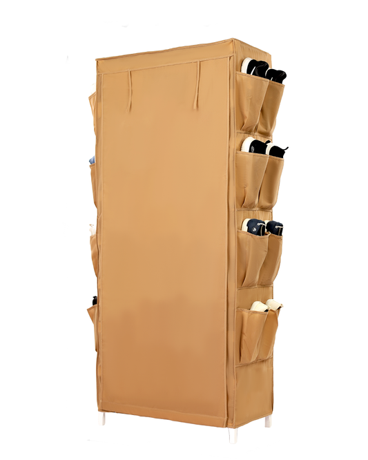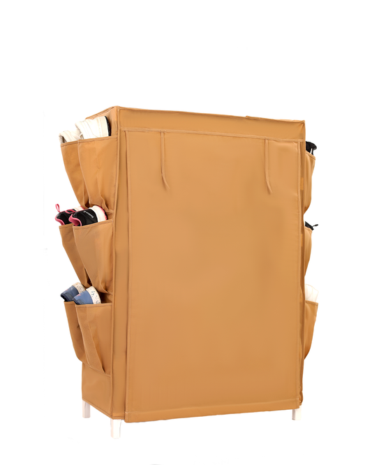 Beige Shoe Rack W/Fabric Cover, 8 Shelves, and 8 Pockets On Each Side