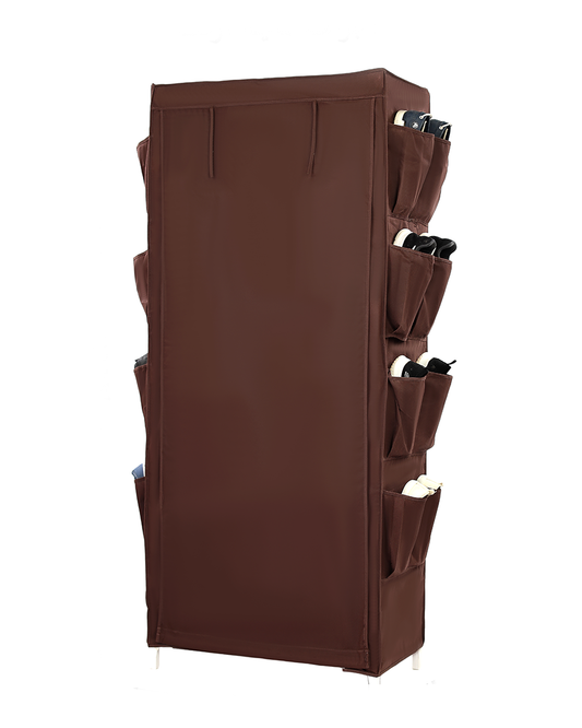 Brown Foldable Non-Woven Wardrobe With Four Shelves, a Hanging Bar, and Twelve Side Pocket