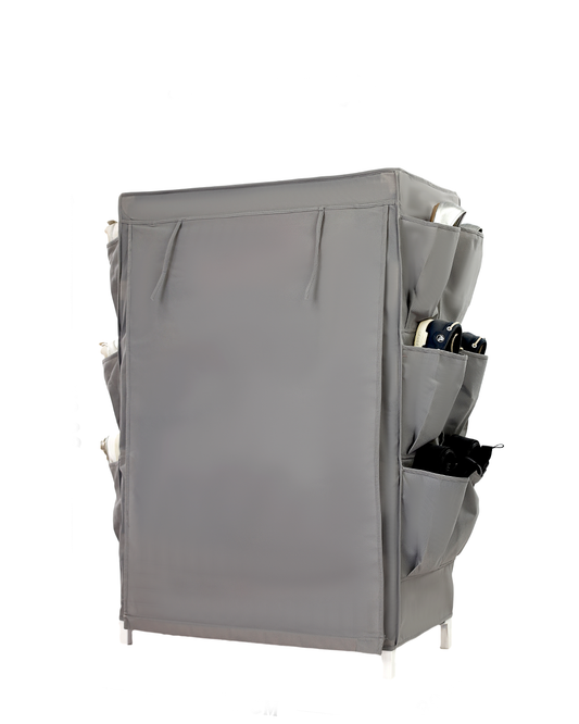 Gray Foldable Non-Woven Wardrobe With Four Shelves, a Hanging Bar, and Twelve Side Pockets