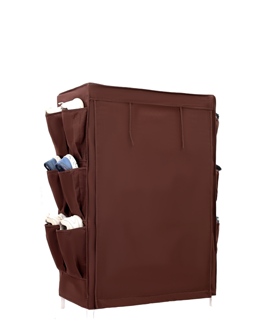 Brown Shoe Rack W/Fabric Cover, 8 Shelves, and 8 Pockets On Each Side